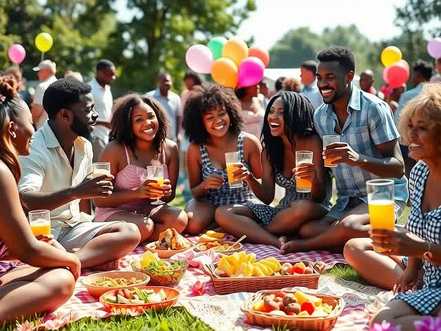 The scene illustrates a lively outdoor picnic featuring a diverse group of Black men and women enjoying a joyful gathering. Here’s a detailed visual breakdown of the elements present: